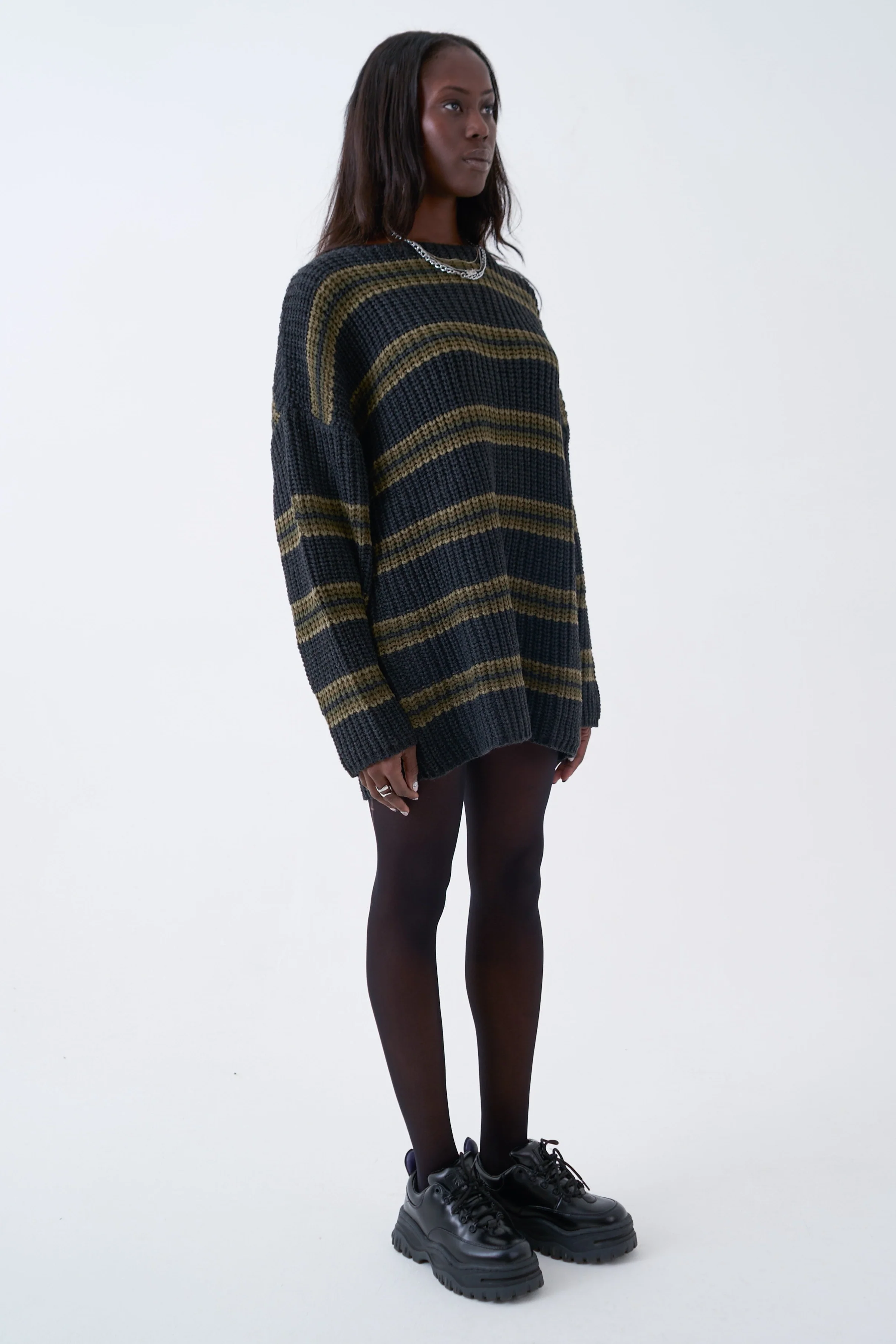 Black and khaki stripe oversized jumper dress in a textured rib knit. Wear as a super oversized jumper or as a dress for a cosy look with an edge.