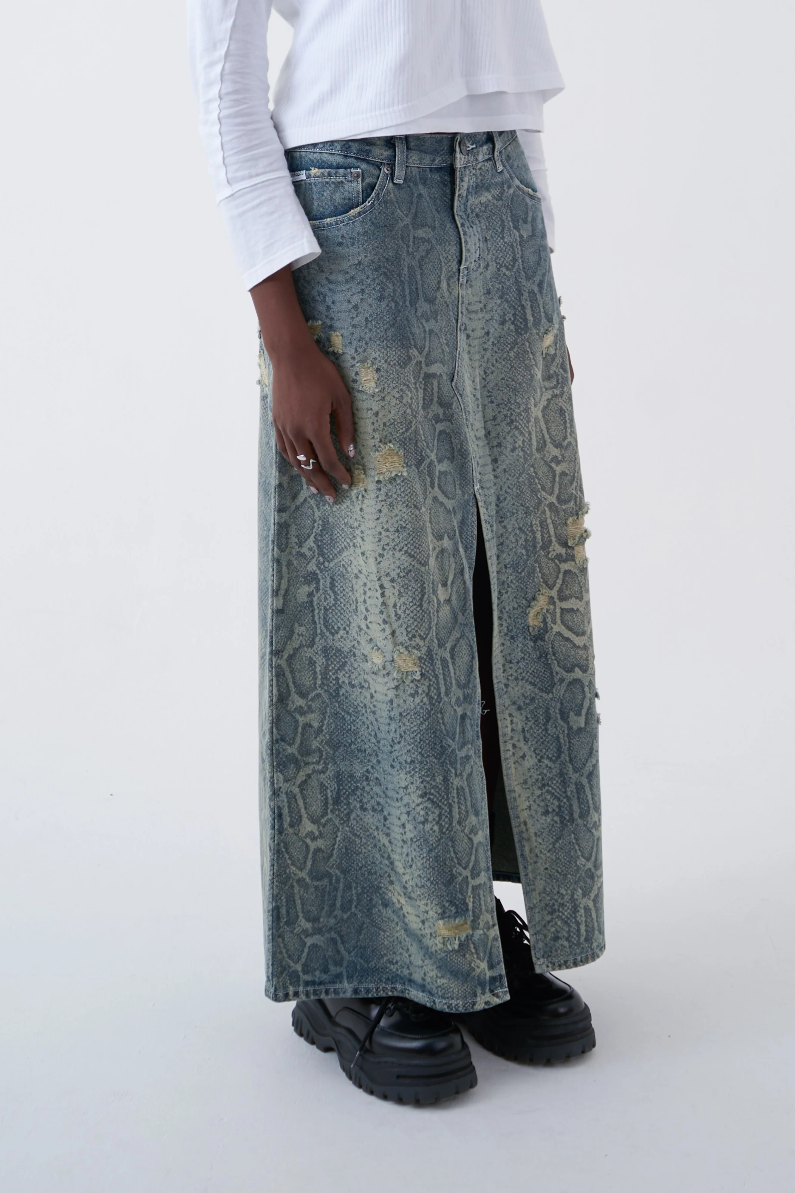 5 pocket denim maxi skirt with front split in snakeskin print, with distressed details for a grunge finish.